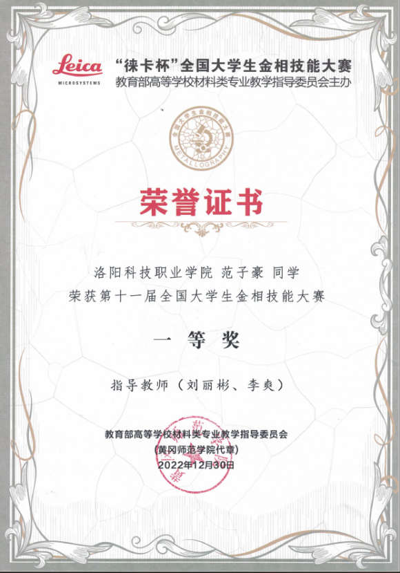 2022年,获第十一届全国大学生金相技能大赛国赛一等奖1项,二等奖1项,三等奖1项
