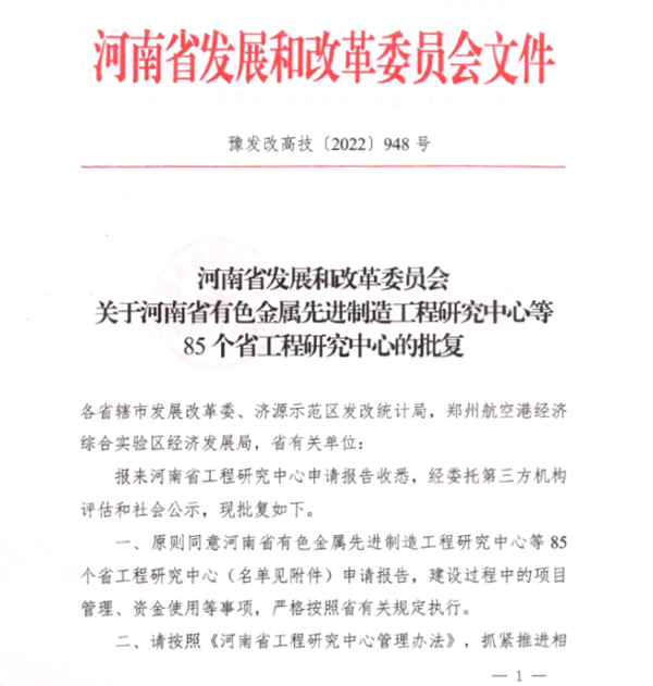 2022年,河南省钨钼材料数字成型工程研究中心被河南省发改委认定为河南省工程研究中心
