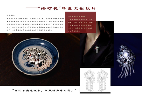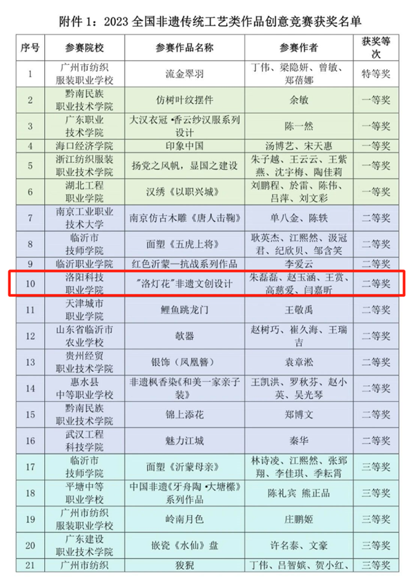 近日,由中国-东盟教育周组委会秘书处指导、全国非遗职业教育集团主办,以及多所高校研究院共同承办的“2023全国职业院校师生非遗作品创意大赛”决赛成绩揭晓。 洛科书院工坊辅导教师刘丹宇、闫嘉昕带领学生朱磊磊、赵玉涵、王赏、高慈爱共组团队参加了此次大赛,原创作品《“落灯花”非遗文创设计》从来自全国117所院校的268件参赛作品中脱颖而出,荣获此次大赛二等奖,并入围全国创意大赛组前十名。