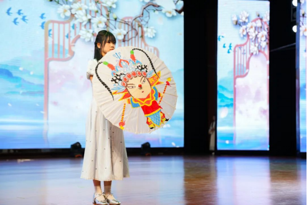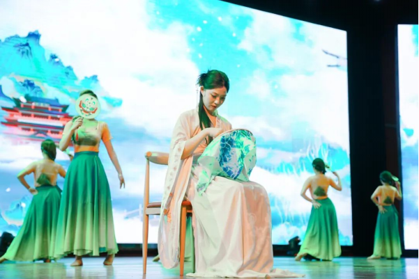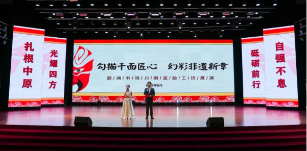 舞台上,非遗艺术与青春创意交相辉映,奏响文化传承的时代强音。“红忠紫孝、黑正白奸”的脸谱彩绘与刚健武术结合,让静态脸谱化作鲜活的文化符号;银针穿梭,彩线翻飞,绣娘指尖流淌的不仅是织物经纬,更是跨越时空的匠心传承,与翩跹舞者的灵动身影交织,勾勒出非遗技艺生生不息的传承脉络;文创走秀环节,青年学子用现代设计语言解构传统元素,赋予非遗文化青春活力;川剧变脸以瞬息万变的绝技,展现中华优秀传统文化的无穷魅力。