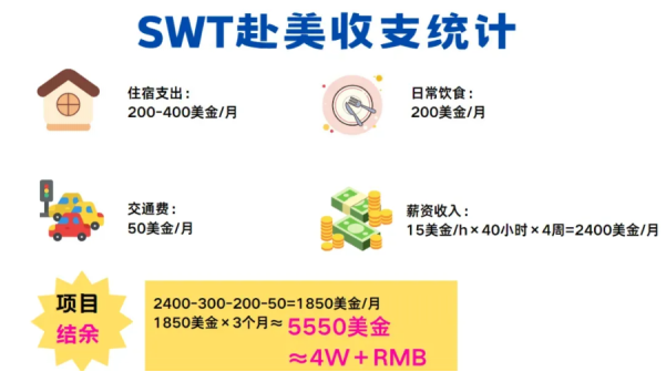 传统游学周期短/花费高,尤其发达国家,一两周花费上万,对于学生来说过于高昂!带薪实习降低在美开销,减轻经济负担。SWT为期2-4个月:打工+旅行、收支平衡、结余数万......成功实现低成本赴美。