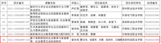 曾世英课题组(曹文杰、张爱芳、光景、王瑞娇)负责的《基于高职院校的法治教育与家庭教育、社会教育互动机制研究》教育法治专项课题顺利通过项目验收。