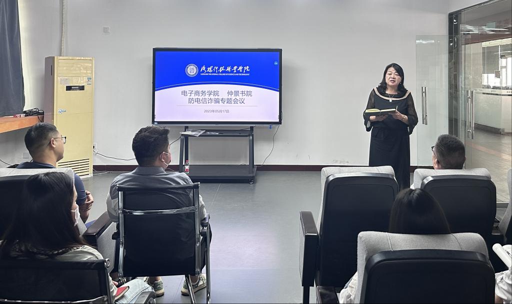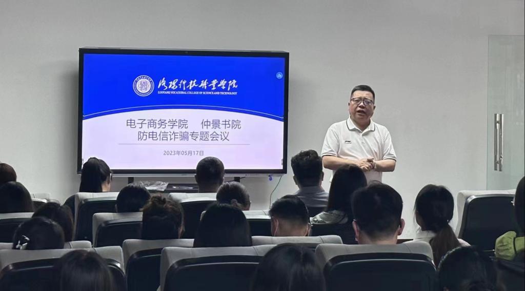 、仲景书院共同召开防电信诈骗会议,会议由电子商务院长张甲立主持,特邀副校长杨建宏到会指导并做安全专题讲座,电子商务海立方娱乐城