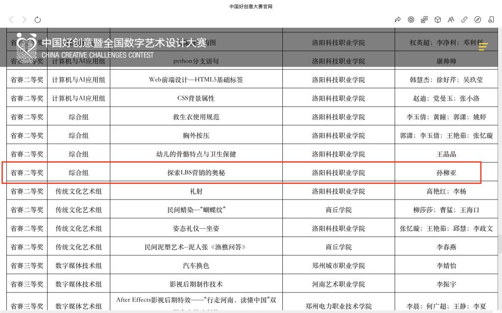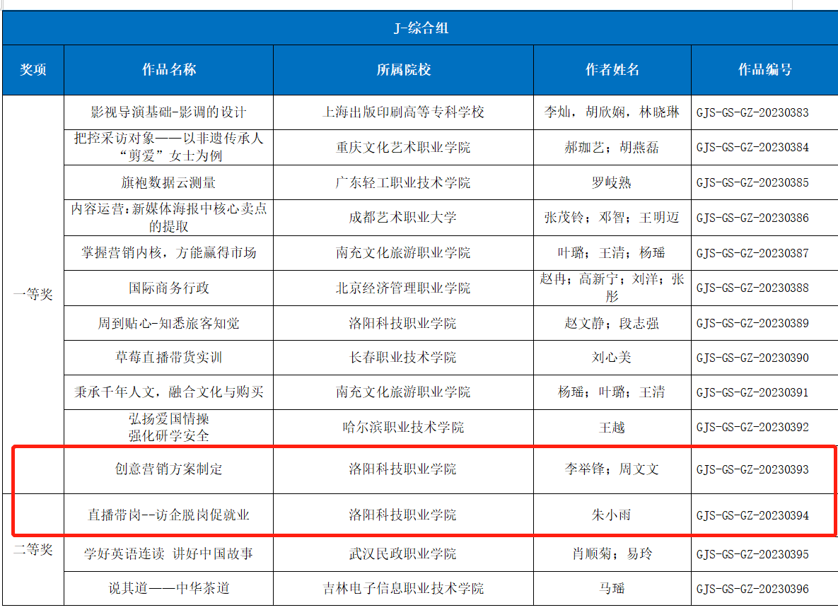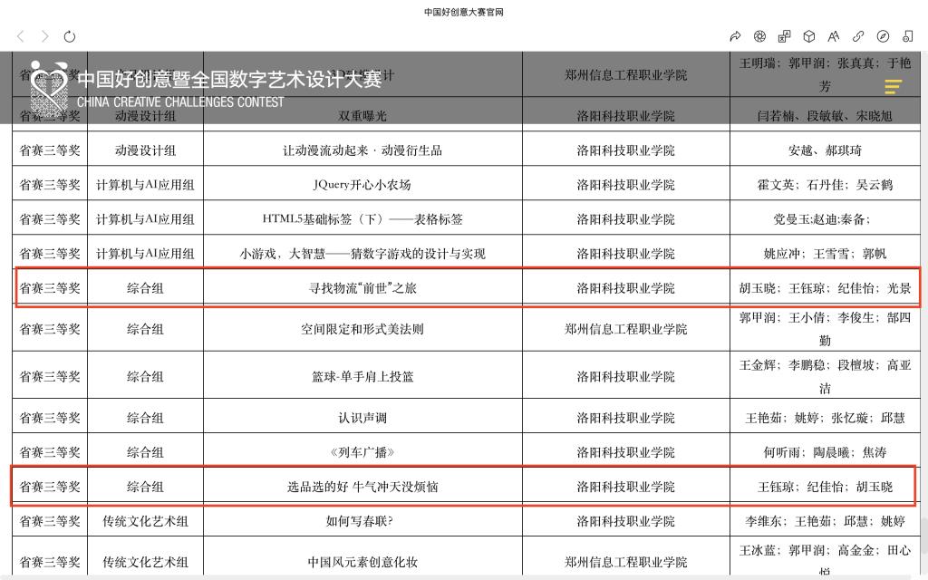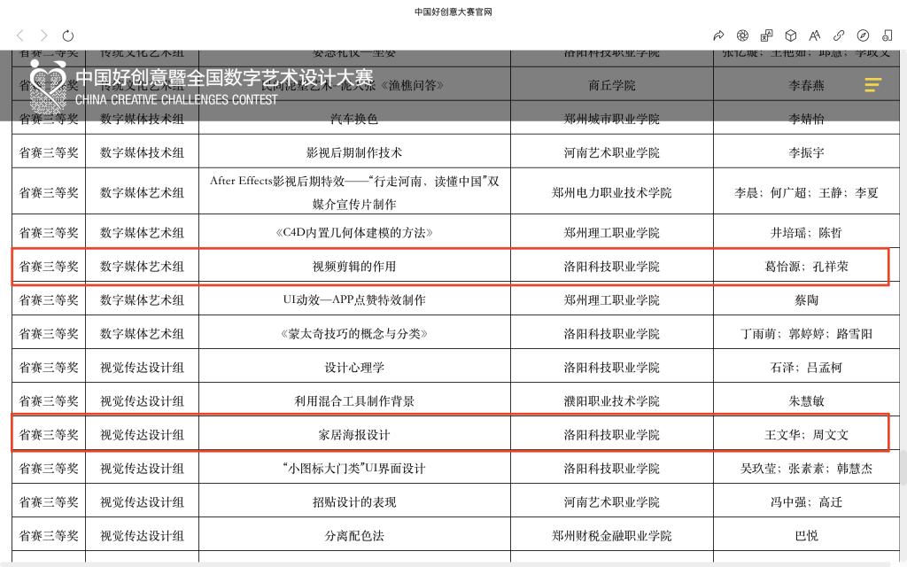 孙柳亚作品《探索LBS营销的奥秘》获综合组省赛二等奖;葛怡源、孔祥荣作品《视频剪辑的作用》获数字媒体艺术组省赛三等奖;王文华、周文文作品《家居海报设计》获视觉传达设计组省赛三等奖;胡玉晓、王钰琼、纪佳怡、光景作品《寻找物流“前世”之旅》和《选品选的好 牛气冲天没烦恼》获综合组省赛三等奖。