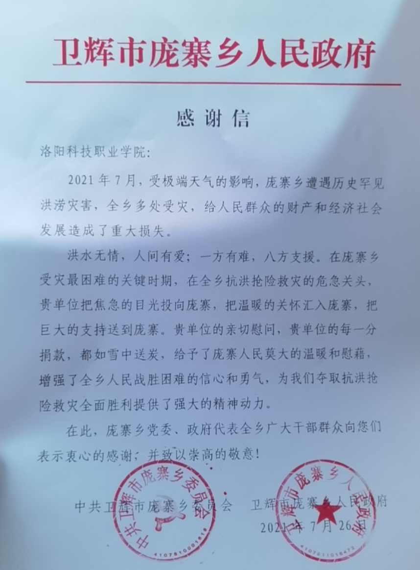 也收到了来自卫辉市旁寨乡人民政府的感谢信。