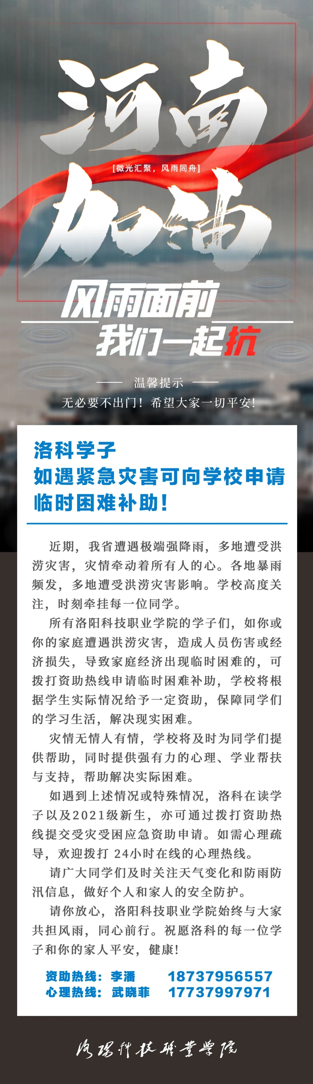 积极落实防汛救灾应急预案和防汛救灾实施方案,全面动员部署防汛救灾工作,组织物资捐赠、善款筹集。同时,认真开展心理疏导和安全教育,与广大学子一起共担风雨,守望相助!
