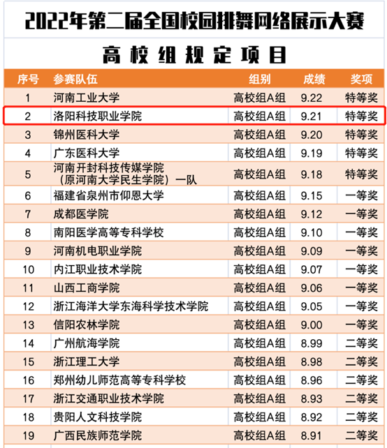 代表队以9.21分的优异成绩荣获高校组A组特等奖,教练员崔亚宁与李鹏稳获得优秀教练员荣誉称号。