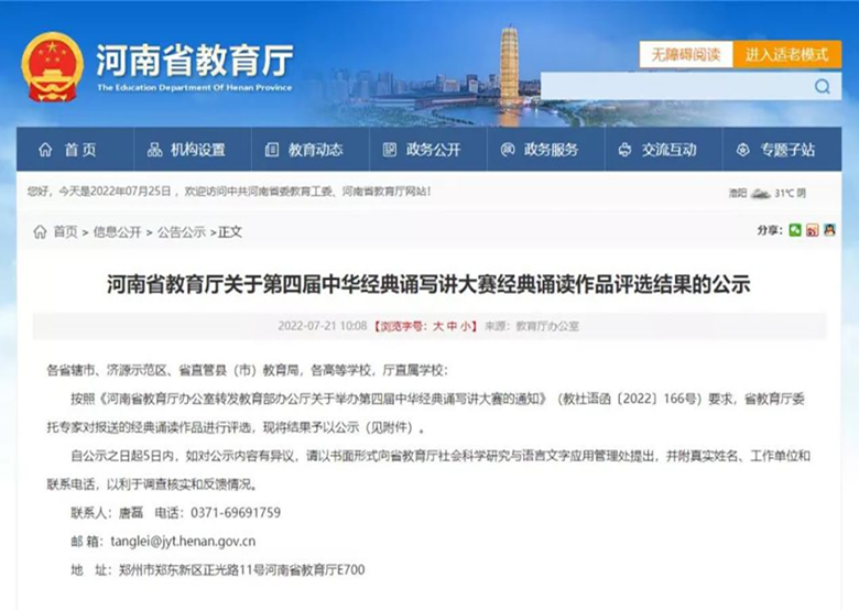 中华经典诵写讲大赛是教育部、国家语委经典诵读工程品牌活动,此次“典籍里的中国”中华经典诵读大赛为河南省“喜迎二十大 欢乐进万家”十大群众文化活动之一。据悉,本届活动吸引了全省100多万人积极参与,举办赛事3000余场。
