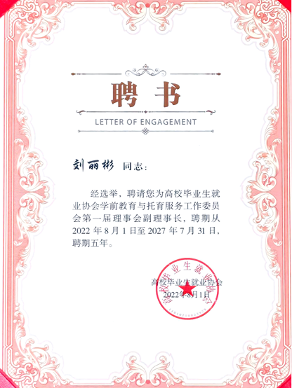 当选高校毕业生就业协会学前教育与托育服务工作委员会副理事长单位,刘丽彬担任副理事长。