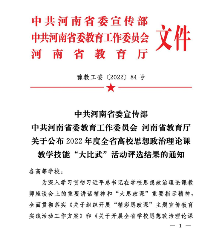 日前,中共河南省委宣传部、中共河南省委教育工作委员会、河南省教育厅发布《关于公布2022年度全省高校思想政治理论课教学技能“大比武”活动评选结果的通知》(豫教工委〔2022〕84号)。