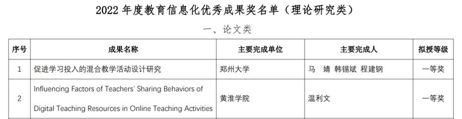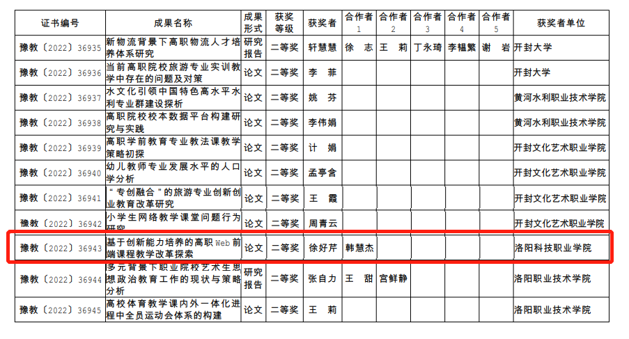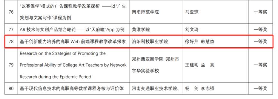 徐好芹、韩慧杰两位老师的论文《基于创新能力培养的高职Web前端课程教学改革探索》获得论文类省级二等奖。同时,该论文也在河南省教育厅2022年6月份公示的《2022年度教育信息化优秀成果》中,获得理论研究类一等奖。