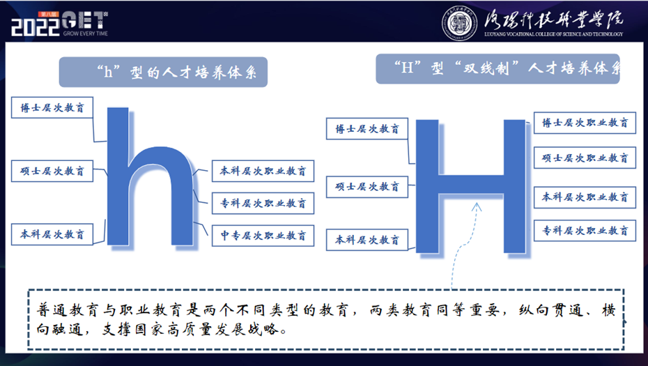 刘丽彬从普通教育与职业教育的现状与差异化入手,阐述了普通教育与职业教育是两个不同类型的教育,两类教育同等重要,纵向贯通、横向融通,支撑国家高质量发展战略。