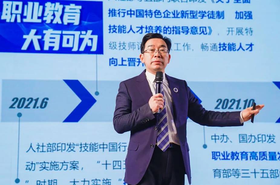 的高质量发展为例,作了《构建“一体两翼”育人模式,培养高素质技术技能人才》的主题演讲,深入分析了职业教育行业的现状及发展前景,论证了职业教育前途广阔、大有可为。