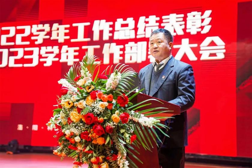 在新民学堂举行2022学年工作总结表彰暨2023学年工作部署大会,会议由校党委副书记、副校长牛耀堂主持,党委书记刘茂钦,党委副书记、校长刘丽彬博士等校领导与全体教职工共同参加。
