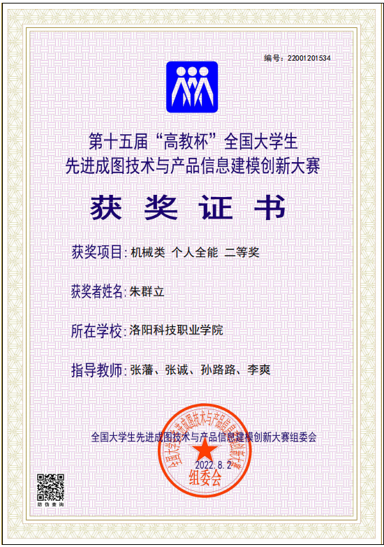 2022年,获第十五届全国大学生先进成图技术与产品信息建模创新大赛国赛二等奖1项,三等奖2项