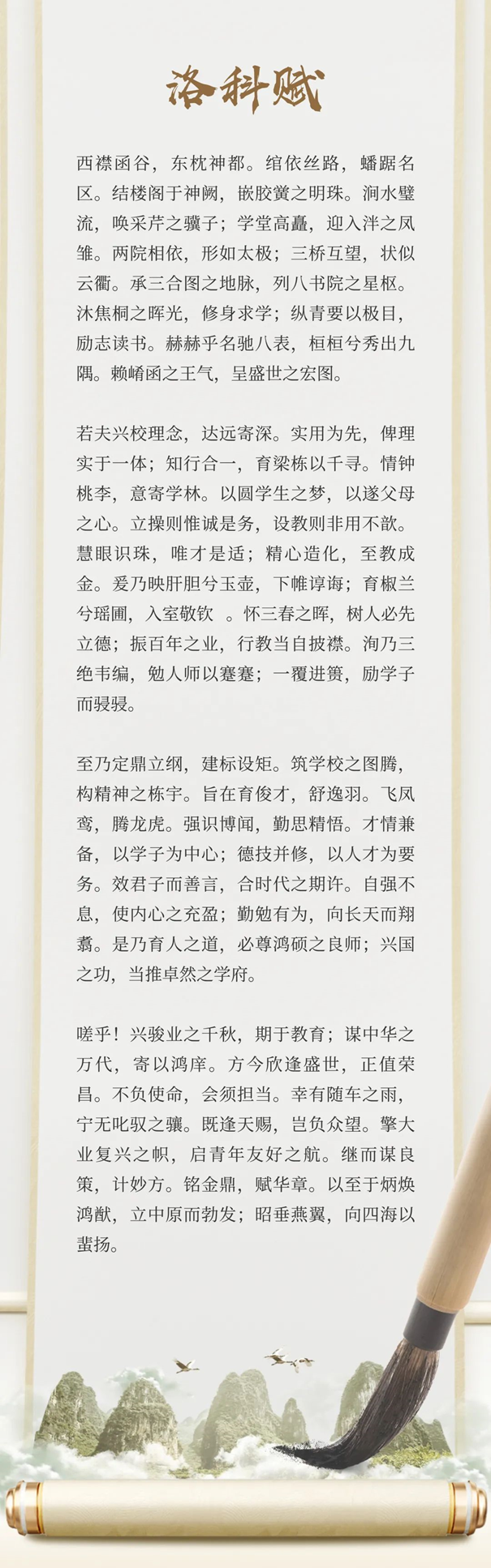 历时一年六个月,经多次斟酌、修改、打磨、探讨和征询,并邀请洛阳辞赋界、考古界和青铜器研究专家学者先后五次召开《洛科赋》《洛科鼎铭文》创作学术研讨会,在集体创作、研讨和广泛征集意见建议的基础上,《洛科赋》《洛科鼎铭文》得到了专家学者、广大师生、校友的高度认可和一致认同。
