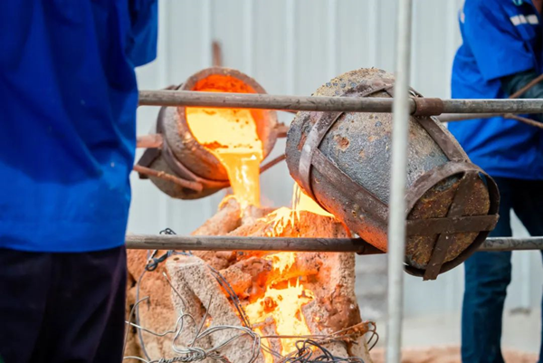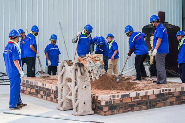 千度淬炼,炉火纯青。1200度的铜水出炉,沿浇注孔缓缓注入洛科鼎模具,待铜液冷却后,打碎外范,掏出内范,将所铸的铜器取出,再经由打磨修整。随着最后一炉铜水的浇筑到位,在掌声和欢呼中、在全体人员的共同见证下,宣告本次浇注仪式圆满礼成!