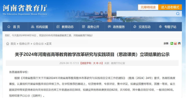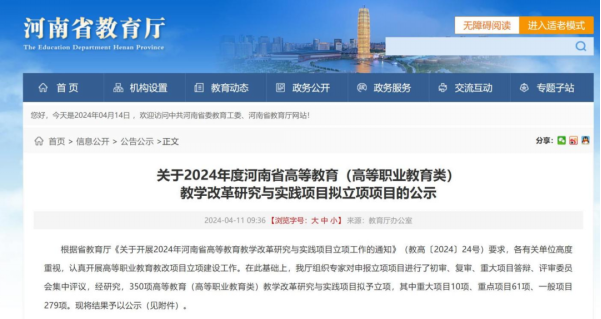 近日,河南省教育厅发布了《关于2024年度河南省高等教育(高等职业教育类)教学改革研究与实践项目拟立项项目的公示》《关于2024年河南省高等教育教学改革研究与实践项目(思政课类)立项结果的公示》。