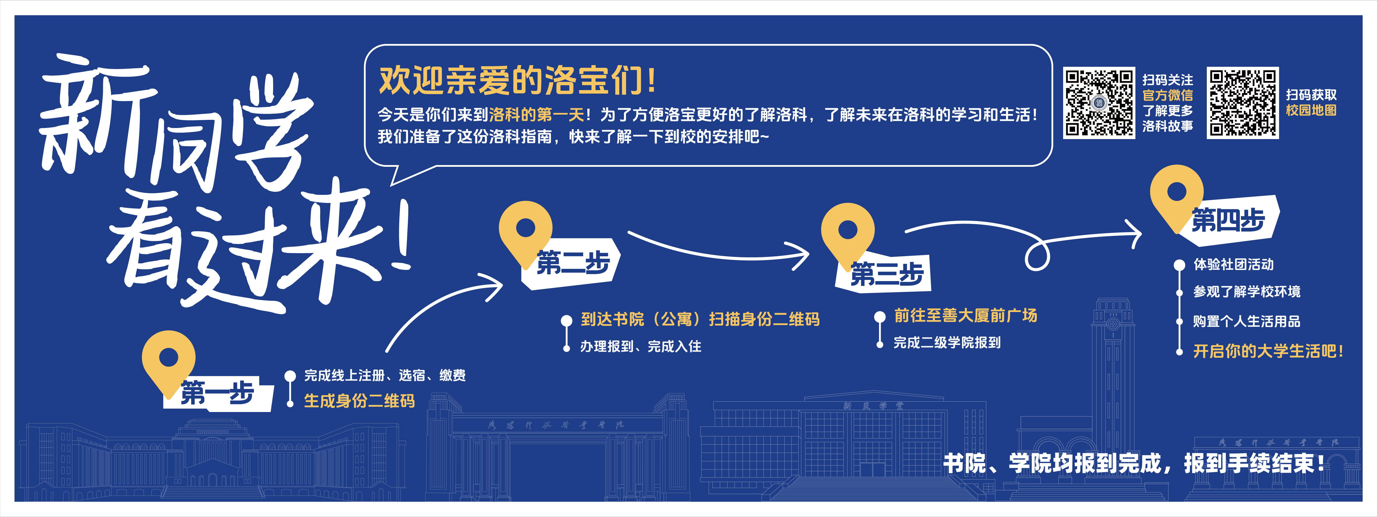 请同学们登录迎新系统,下载或截图保存现场报到码,乘坐爱心行李运送车前往所在书院出示报到码进行报到及入住。安放行李后,请同学们前往至善大厦前广场,到所在海立方娱乐城