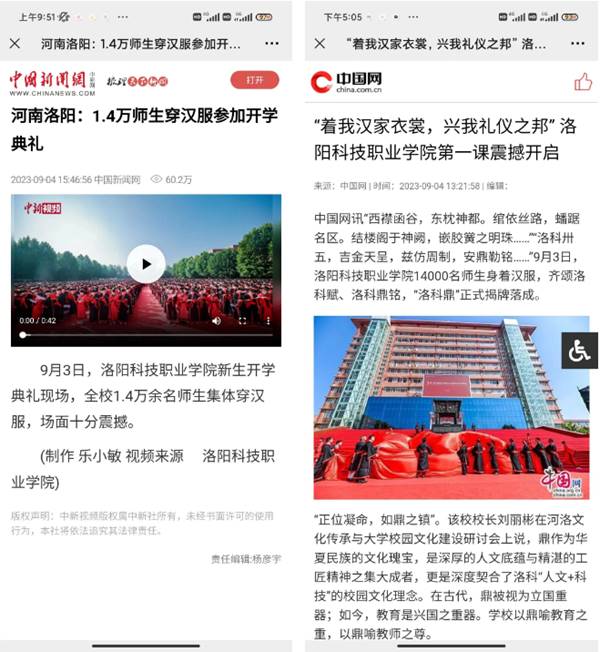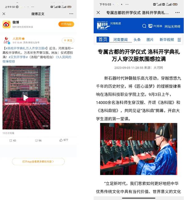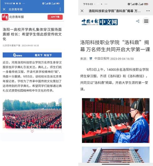 万名师生身穿汉服参加开学典礼及“洛科鼎”置鼎仪式的新闻成为舆论热点,数次冲上热搜。人民网、新华网、央视网、央广网、中国网、中国日报、北京青年报、澎湃新闻等百余家权威媒体平台纷纷报道,河南广播电视台、辽宁广播电视台等电视台进行播报,全网展现量过亿,向全国人民展现了洛科人践行工匠精神,勇担时代重任的精神风貌。媒体盛赞这场活动不仅展现了中华传统文化的独特魅力,也让越来越多的年轻人开始关注并传承这一传统,向全社会展现了青年一代对传统文化的热爱和坚守。