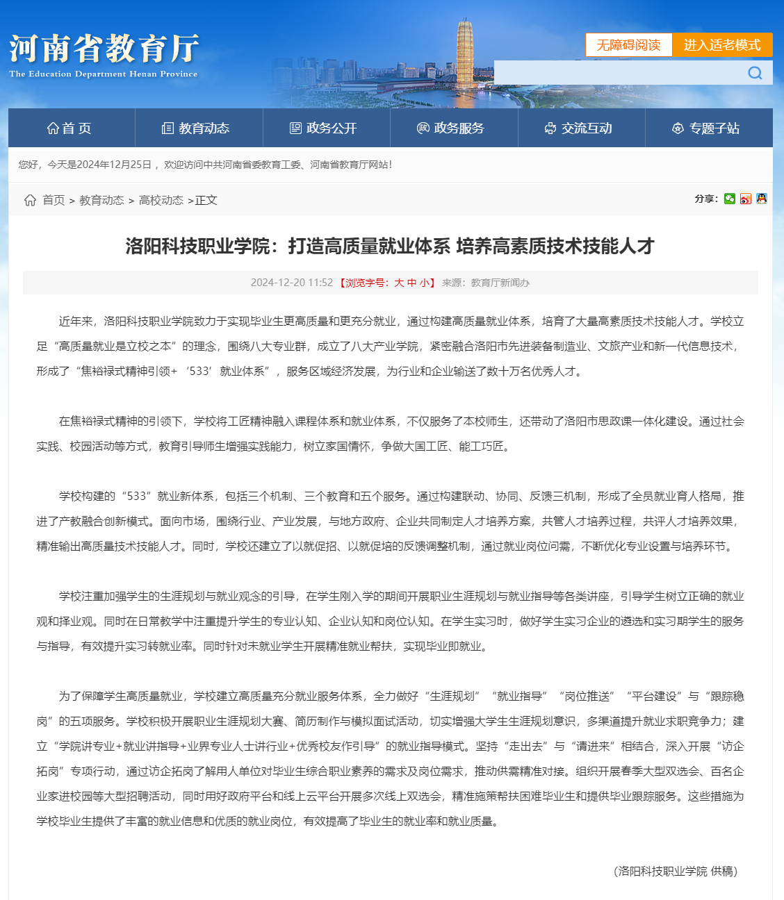 ,紧密融合洛阳市先进装备制造业、文旅产业和新一代信息技术,形成了“焦裕禄式精神引领+‘533’就业体系”,服务区域经济发展,为行业和企业输送了数十万名优秀人才。