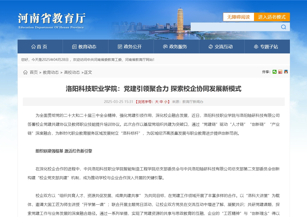 与洛阳轴研科技有限公司签署校企党建共建协议及教师职业技能提升培训协议。此次合作以基层党组织共建为突破口,通过“党建链”驱动“人才链”“创新链”“产业链”深度融合,为新时代职业教育服务区域发展树立“洛科标杆”,为区域经济高质量发展与职业教育进步提供创新范例。