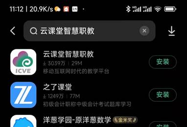 1.打开手机应用市场/应用商店,搜索“云课堂智慧职教”APP,点击下载安装。