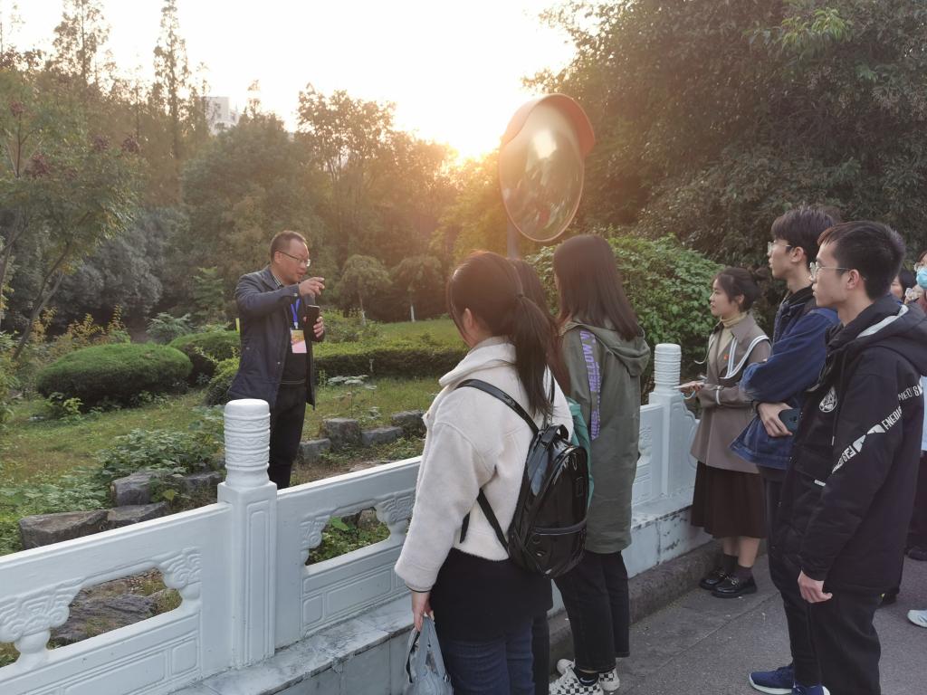 第二站是天鹅湖。陆斌处长讲到一旦下雨,作为南财最高点的丁山,山体泄洪通过管道汇聚到天鹅湖,同时陆处长还指着湖边的管道向大家补充讲解,“那个管道起着警戒线的作用,监控着天鹅湖的水位,一旦水位漫过管道洞口,超过警戒水位,下游就会打开阀门,避免天鹅湖水位过高”。大家惊叹原来天鹅湖除了可以赏景,在日常生活中还发挥着至关重要的作用。紧接着,陆斌处长向大家提问“那么到达天鹅湖后的雨水接下来又该怎么走?”于是,大家带着这个问题走向第三个景点。