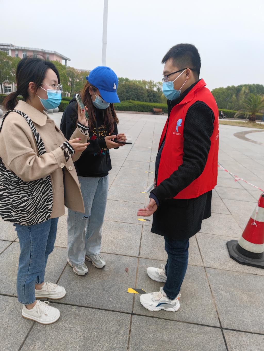 教师党员志愿者在大学生活动中心核酸检测现场