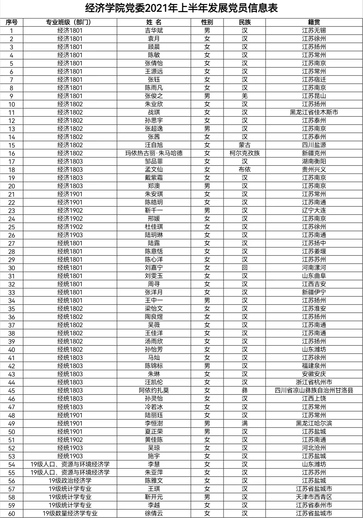 党委预审,拟接收吉华斌等60名同志为中共预备党员。现将名单予以公示: