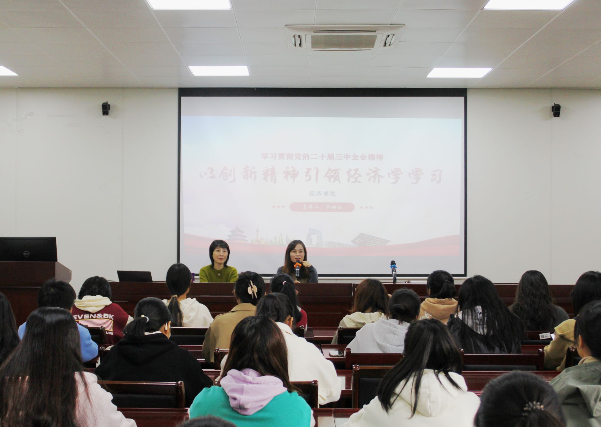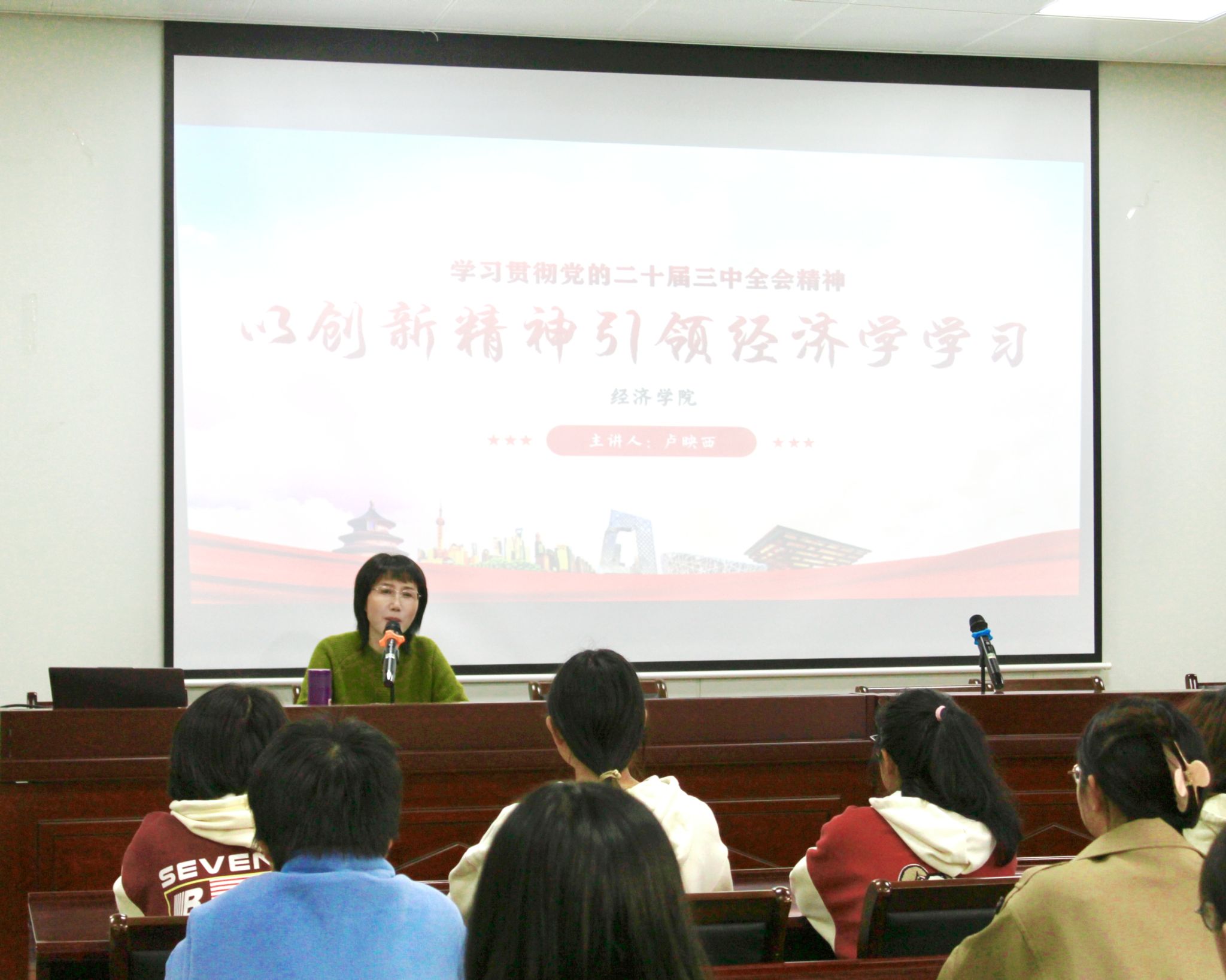 卢映西教授以“以创新精神引领经济学学习” 为主题,从微观角度对政治经济学、微观经济学和宏观经济学进行了介绍,详细讲解了当代大学生贯彻党的二十届三中全会精神的路径、方式和方法,强调了创新体制机制、教育体制以及人才发展体制改革的重要性。她还从三个角度解答了为何要学习理论和思想,重点指出同学们需要带着问题学习,关注财经新闻动态,培养创新思维。卢映西教授着重讲述了经济思想和理论的发展历史,从亚当・斯密到马克思,从前古典经济学时代到新古典综合阶段,呈现了一堂别开生面的经济历史课,为强化同学们对经济学科的认识、拓展经济学视野、提升学术素养提供了方向指引。