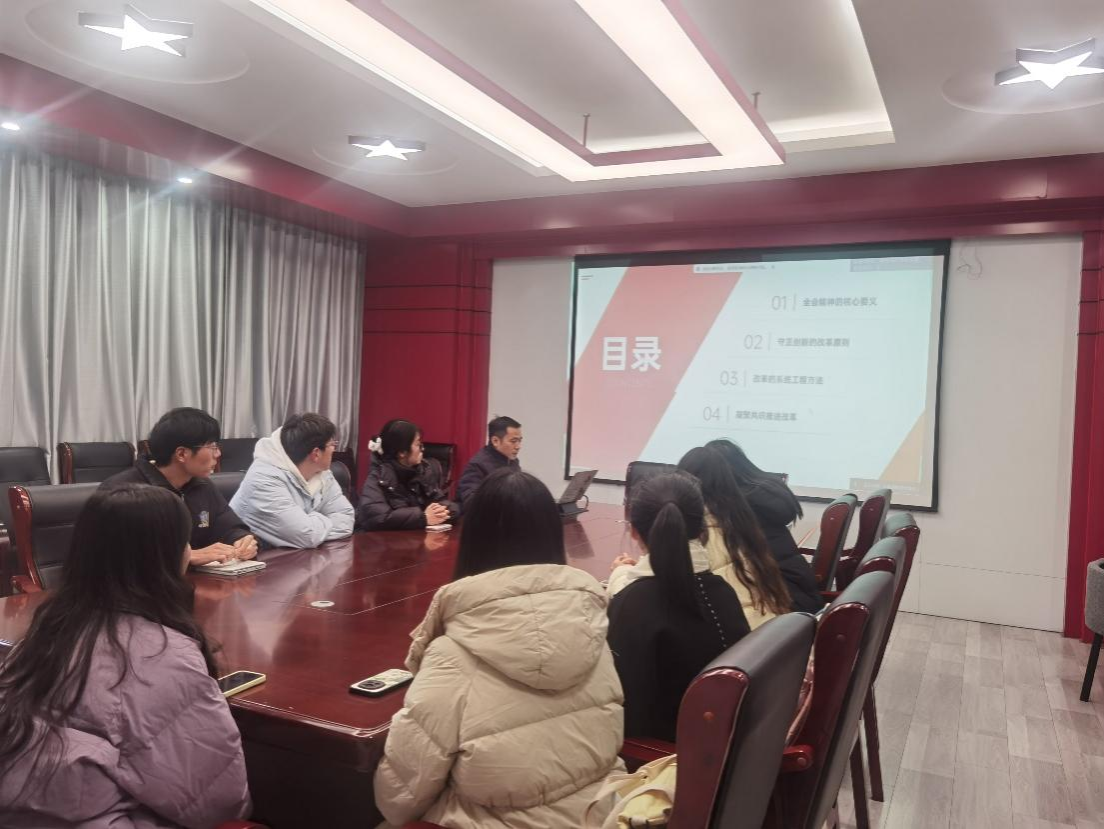 会议初始,韩中老师介绍了本次党课学习的背景和重要意义,强调了习近平总书记重要讲话精神对研究生党员的学习和研究工作的指导作用,以及对个人政治素养提升的重要性。会议过程中,韩中老师带领大家学习习近平总书记的重要讲话内容,分别从全会精神的核心要义、守正创新的改革原则、改革的系统工程方法、凝聚共识推进改革进行学习。