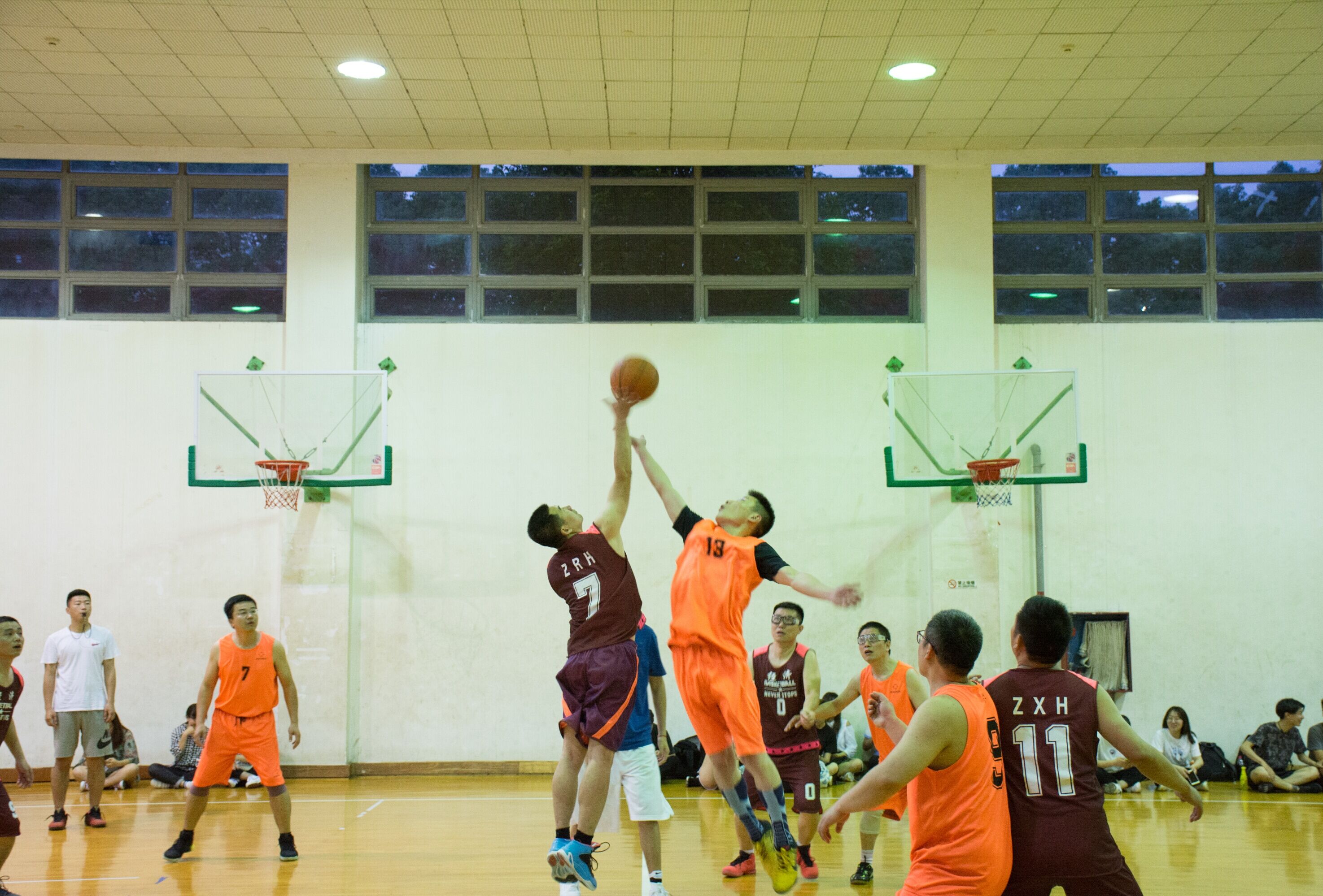 5月19日晚,体育馆主馆内热闹非凡,呼声不断,经济联队和机关队之间的教职工篮球比赛季军之争在此激烈展开。