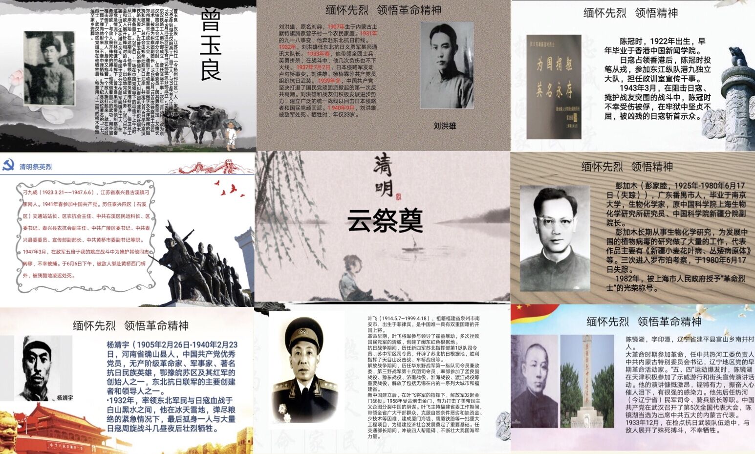 在同学们的介绍和叙述中,有抗战时期在东北与日寇血战到底,弹尽粮绝后英勇就义的杨靖宇将军;有太平洋战争时期,冒着生命危险多次在香港运送党的秘密文件,最终不幸暴露牺牲的陈冠时烈士;有革命时期屡建战功,创建闽东革命根据地,又在建设时期为国家交通运输事业做出巨大贡献的叶飞将军;有15次入疆、3次进入罗布泊地区,为我国边疆自然资源和自然条件科考付出年轻生命的新疆科海立方娱乐城