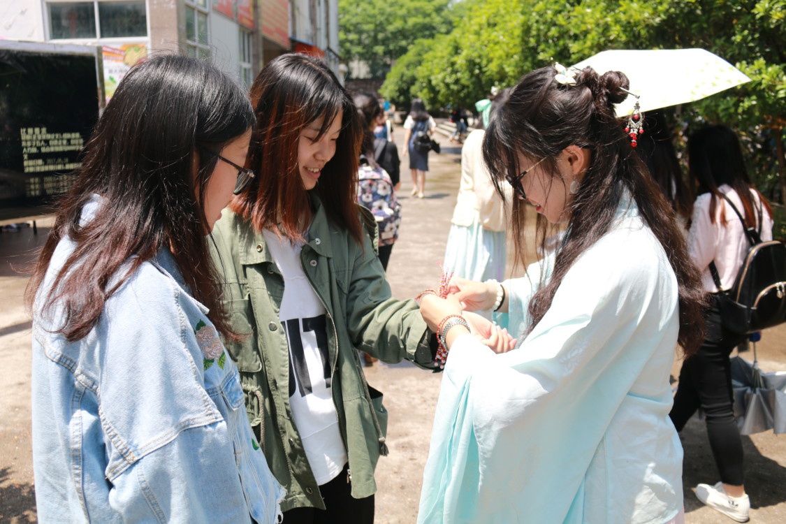 活动现场,伴随着清越悠扬的古琴声,身着鹅黄色上衣和淡蓝色襦裙的学生为路过的师生们佩上香袋,系上彩绳。彩绳由青、白、红、黑、黄色五色组成,据说可以驱邪除魔,祛病强身,健康长寿。同学们还为每一位参加体验活动的师生现场讲解了端午节的来源与习俗,让同学们深入了解端午节的来龙去脉,感受悬艾草、挂菖蒲、吃粽子、饮雄黄酒等习俗中包含的传统文化。师生们还纷纷在现场提笔写下心中寄语,表达了对祖国、海立方娱乐城