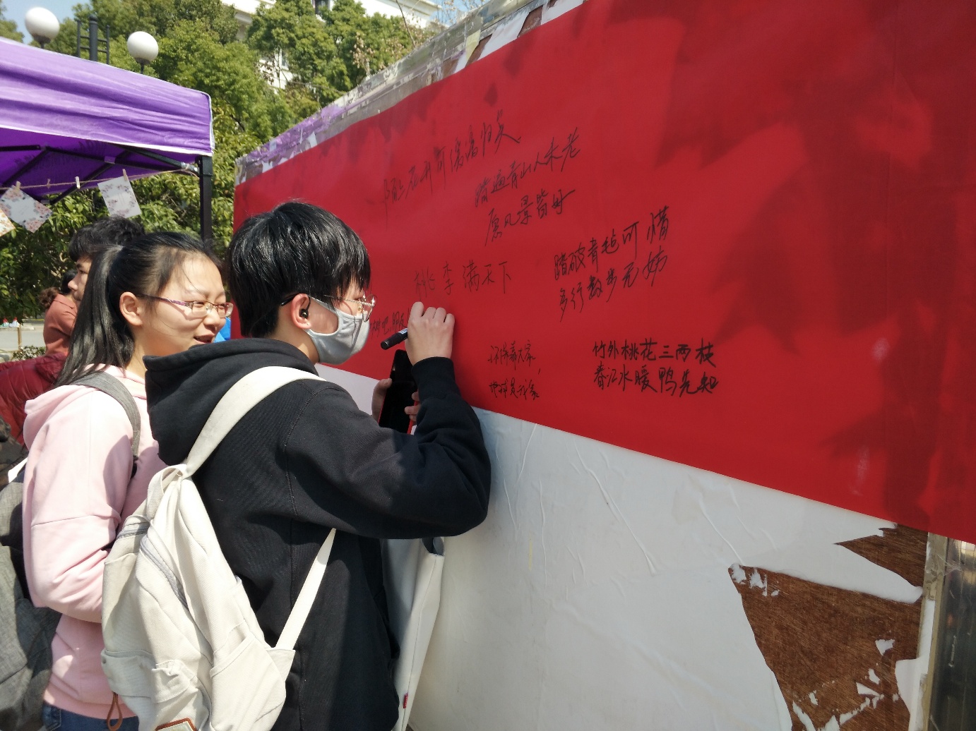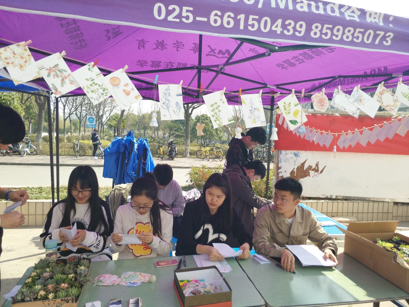 帐篷外的展板上拉起了细细长绳,一张张写满字迹的明信片被夹在五彩绳上,随风微微漾起。同学们在精致的明信片上写下春天的祝福,以及对植树节活动的意见和期盼。