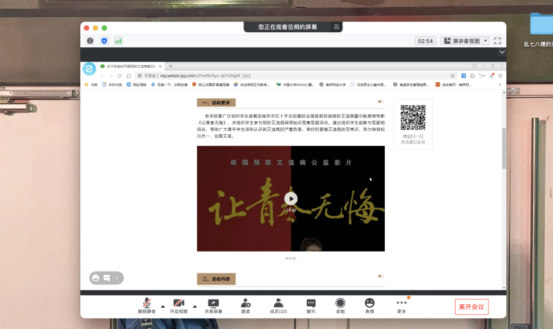 活动分为“影片观看”和“在线答题”两个环节。首先,各团支部积极组织全体同学统一观看微电影《让青春无悔》。《让青春无悔》是由南京市红十字会制作的全国首部校园防艾公益微电影,影片以两名大学生的故事为线索展开,宣传了防艾的重要知识。然后,同学们主动在线参与“防艾校园行”知识竞答比赛。竞赛问卷中的题目不仅是对微电影中出现的重要防艾知识的回顾,也是对防艾基本常识的科普与考核,帮助同学们进一步深化对艾滋病的理解。