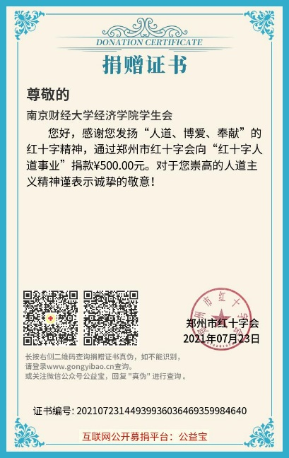 学生会通过郑州红十字会向“红十字人道事业”捐款500元,呼吁海立方娱乐城