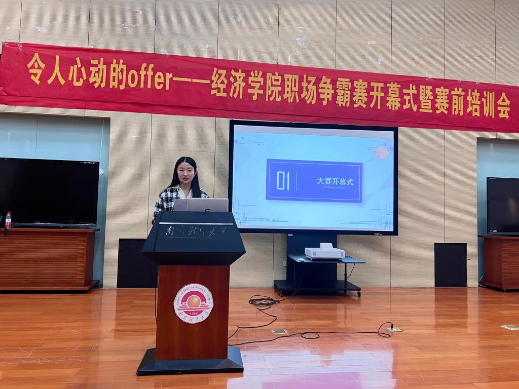分团委书记潘怡老师致辞。她首先肯定了职场争霸赛在助力大学生不断提升个人综合素质和就业核心竞争力,为“就好业”夯实基础、赢得就业竞争主动权等方面起到的促进作用。她指出,在全球疫情冲击、国内需求低迷、全球供应链受阻的背景下,全球经济发展迟缓,经济不景气,消费大幅度降低,从而导致企业岗位招聘需求锐减,高校毕业生面临着严峻复杂的就业形势,就业压力剧增,因此提升职业技能增加自己的就业竞争力,是当前大学生应该要注重的。接着,她为大家介绍了本次职场争霸赛的两大亮点,即“简历指导”和“就业前置”,强调了提升就业核心竞争力、为未来的求职打下坚实基础的必要性。最后,潘怡老师对参加本次大赛的同学们表达了欢迎,希望选手们赛出风格、赛出水平。