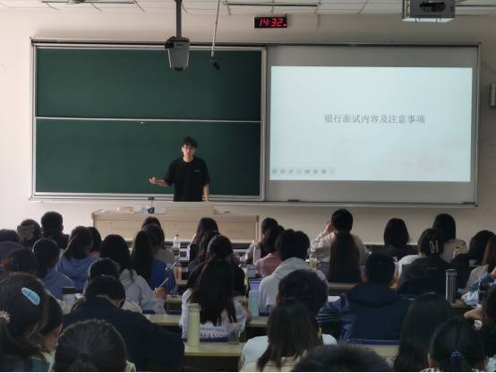 仇怿文同学介绍了自己的求职经历和拿到offer的情况,他认为在求职准备阶段要找到适合自己的方向和赛道,并建议同学们提升数据分析能力和财务分析能力。随后他分享了银行申请、笔试、面试的经验,并给出了备考相关建议,并提醒求职的同学,自我介绍是面试中唯一一次主动输出的过程,同学们应认真准备,充分展现自己的优势,表现自己与岗位的匹配度,并鼓励同学们多尝试多投递简历不要放弃。