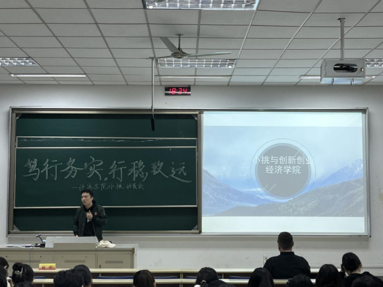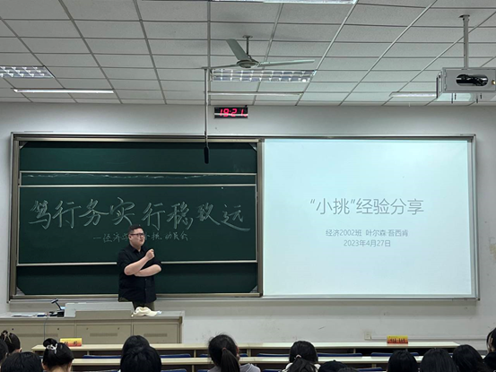 张闻老师作专题讲座,第十三届“挑战杯”中国大学生创业计划竞赛铜奖项目成员、经济2002班叶尔森·吾西同学作经验分享。
