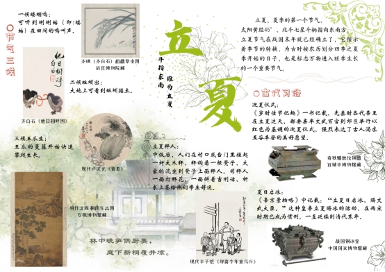 数统2101胡蝶同学以“立夏”为主题,描绘了从蝼蝈鸣、蚯蚓出、王瓜生,到立夏秤人、迎夏启冰的立夏画像。选取画作包括齐白石《稻穗草虫图》、齐白石《他日相呼图》、卢延光《消青瓜》、沈周《桐荫乐志图》、丰子恺《却喜今年重几斤》。