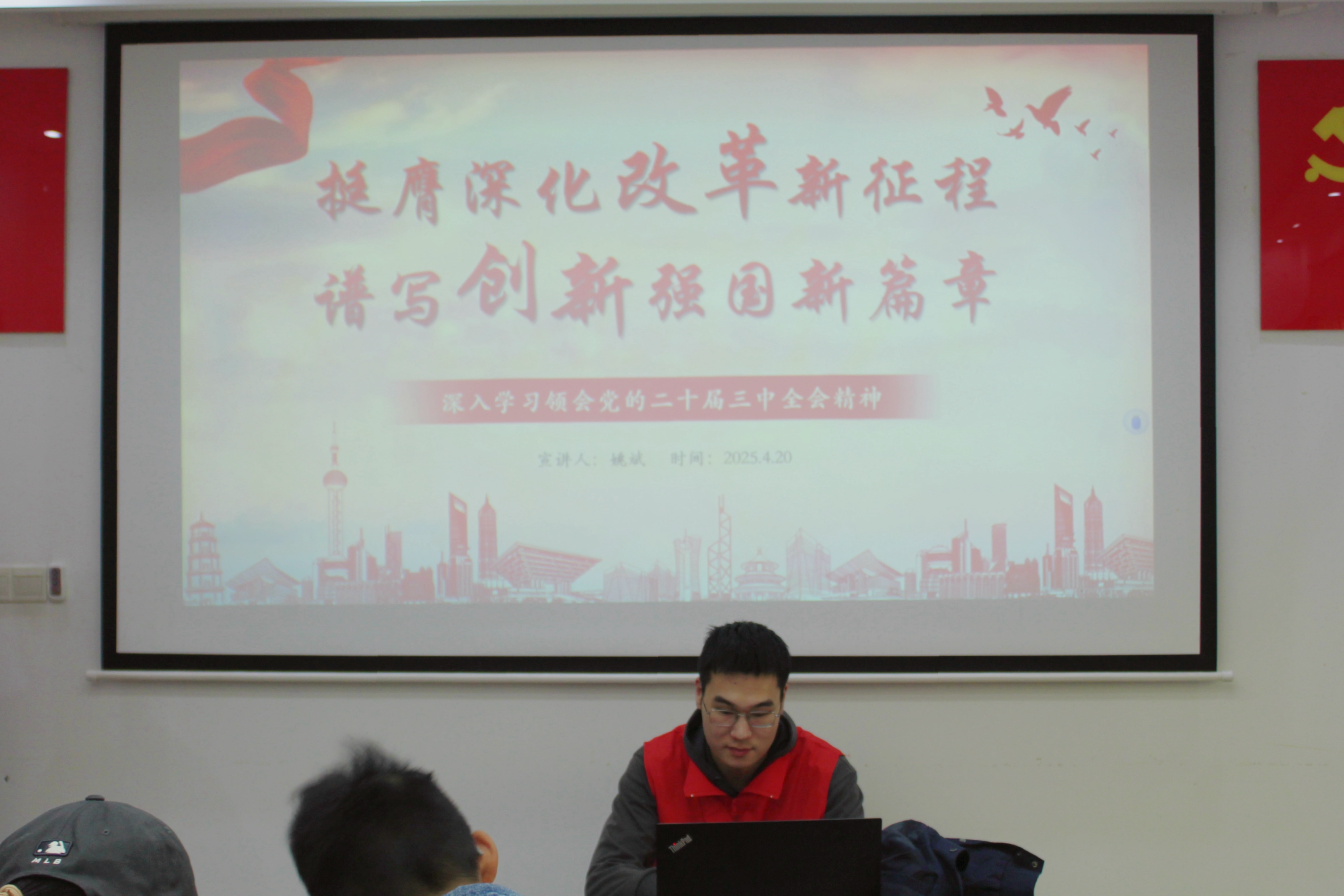 活动中,中共预备党员姚斌同学以党的二十届三中全会精神为核心开展理论宣讲,他回顾自党的十一届三中全会以来改革历程,指出党的二十届三中全会是在以全面推进中国式现代化强国建设、民族复兴伟业的关键时期召开的战略性会议,具有继往开来的里程碑意义。同时他呼吁学生群众积极投身改革实践,紧密团结在党中央周围,踊跃参与强国建设和民族复兴实践。