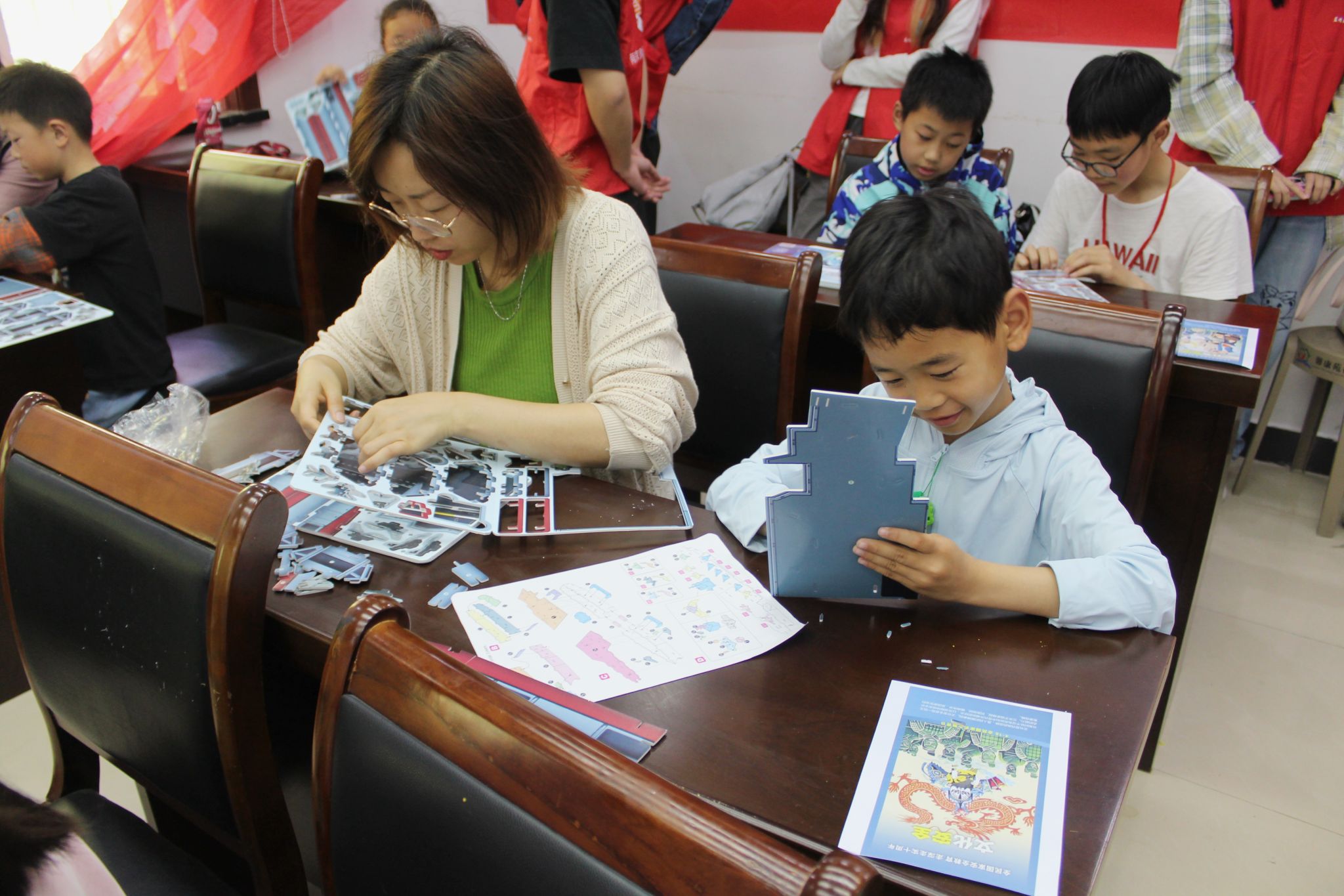 理论宣讲结束后,活动进入志愿服务环节。在手工模型制作区,志愿者耐心指导孩子们拼接航船模型,锻炼其创造力与动手能力。而在帆布包手绘区里,志愿者与孩子们在空白帆布包上勾勒五彩图案,用颜料创作出独一无二的个性作品。手抄报制作现场同样精彩纷呈,孩子们以海军舰艇等航船元素为灵感,用文字与图画表达爱国之情与未来憧憬。