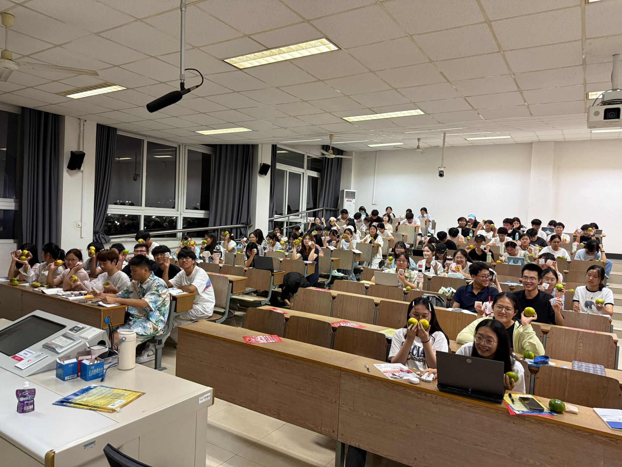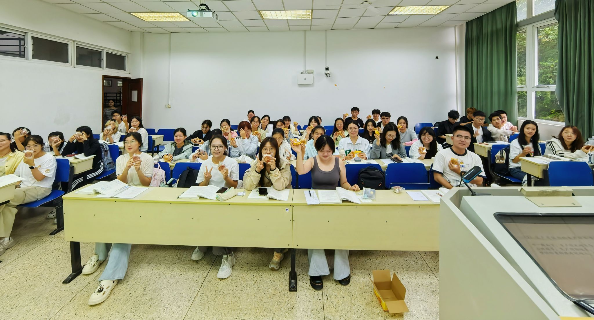 教室里,窗明几净,双节的喜悦早已悄然漫溢在每一个角落。负责分发的同学们带着笑容,将封装整齐的月饼与新鲜饱满的水果一一递到同学手中,动作间满是细致与热情;接过这份心意的同学们,指尖触到包装的瞬间,眼底便漾开期待的光彩。