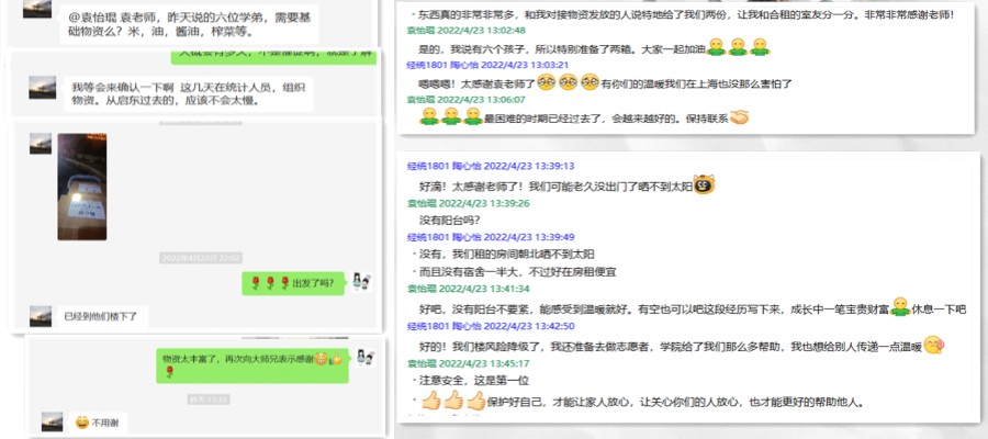 第一时间在校友班级群中发布求助信息,党委书记陈耀辉老师亲自动员。统计032班校友迅速响应,身在上海的校友纷纷出谋划策。4月22日晚10点,一名身在启东的校友经多方努力,为受困学妹们送去了包括米、油、面粉、酱油、榨菜、玉米等在内两大箱基础物资。仅用2天时间,在全域静态管理下的上海,完成了几乎不可能完成的爱心援助,书写下跨越15载的校友之情,滞留上海的毕业生十分感动,在经院毕业生的心中更埋下了爱的种子、情的力量。
