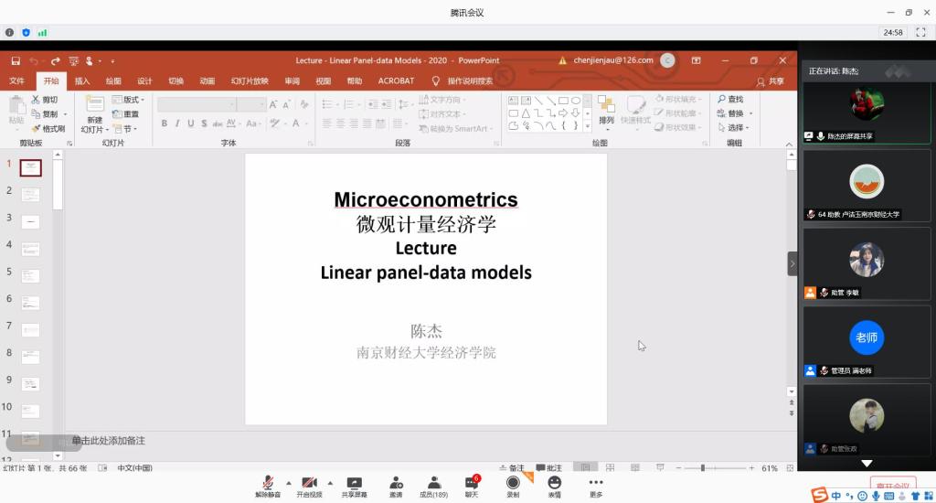 陈老师首先以理论加举例的方式介绍了面板数据的基本情况,随即对一阶差分和固定效应回归进行了对比,着重阐述了固定效应回归模型和随机效应回归模型的基本理论及Stata实现,最后,对面板数据的一般分析步骤进行了总结。授课过程详细具体,有理论分析的深入,有举例分析的浅出,也有Stata介绍的实操,将理论与实例紧密结合起来,不仅使得学员们更好地理解与掌握了理论知识,Stata实现的过程也让学员们更加深刻地体会到面板计量模型的实际应用,获得了学员们的一致好评。