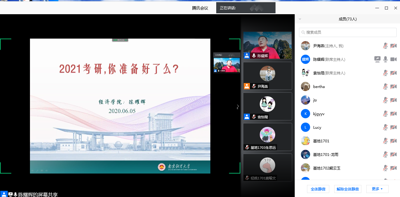 主持人首先介绍了本院2016级学生研究生报考、录取情况和2017级学生考研意向信息,当下的系列活动安排等,鼓励同学们在2021年考研历程中坚持不懈,再创新高。陈耀辉教授从就业还是深造、2020考研现状、考研的动机和如何备考这四个方面,针对考研的严峻形势、专硕与学硕的区别、考研程序与流程等内容进行了细致的分析。陈书记建议同学们在报考时要选择喜欢的、与自己本科学习相关的专业,并清醒的认识自己的实力、找准定位,保持良好的心态。