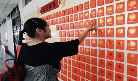 2019级新生在“红包心愿墙”上取下红包的情景