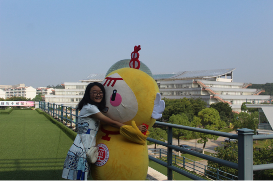 的吉祥物“小经灵”摆出各种姿势欢迎新同学,它憨态可掬的样子博得了很多新生的喜爱,新生们纷纷和它合影留念。